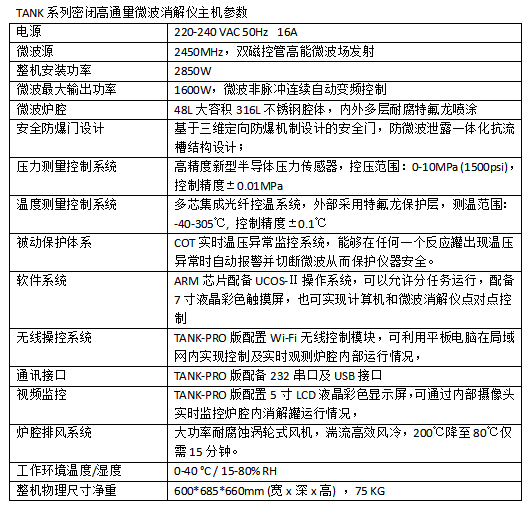 TANK使用ARM芯片配備UCOS-Ⅱ操作系統(tǒng),運(yùn)行穩(wěn)定可靠。采用7寸液晶彩色觸摸屏,觸控操作流暢簡(jiǎn)便。頁(yè)面實(shí)時(shí)顯示工作狀態(tài)及溫壓變化曲線。內(nèi)置專家方法庫(kù),也可自行編輯及存儲(chǔ)用戶方法。內(nèi)置COT實(shí)時(shí)溫壓異常監(jiān)控系統(tǒng)能夠在任何一個(gè)反應(yīng)罐出現(xiàn)溫壓異常時(shí)自動(dòng)報(bào)警并切斷微波從而保護(hù)儀器安全。PRO版獨(dú)有Wi-Fi無(wú)線控制模塊,既可實(shí)現(xiàn)計(jì)算機(jī)和微波消解儀點(diǎn)對(duì)點(diǎn)的控制,也可利用平板電腦等在局域網(wǎng)內(nèi)實(shí)現(xiàn)控制及實(shí)時(shí)觀測(cè),使用戶“舒心實(shí)驗(yàn)、安全實(shí)驗(yàn)”。PRO版亦采用雙屏設(shè)計(jì),另配5寸LCD液晶彩色顯示屏通過(guò)內(nèi)部攝像頭實(shí)時(shí)監(jiān)控爐腔內(nèi)消解罐運(yùn)行情況。